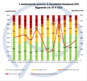 We zitten inmiddels midden in het voorjaar! Dat merken we niet alleen aan het warmere weer, maar ook aan de resultaten van de binnengekomen mestmonsters. De infectiedruk is duidelijk aan het stijgen, zoals we elk jaar rond deze tijd zien.