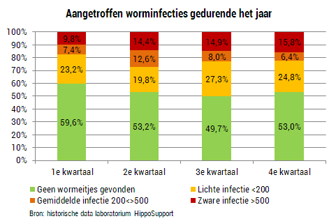 In de grafiek hiernaast zie je per kwartaal wat er aangetroffen werd in de monsters die wij ontvingen. Zoals je ziet troffen wij ook in de wintermaanden (kwartaal 4 en 1) in meer dan 40% van de monsters nog een bloedworminfectie aan. In minimaal 9,8% van de gevallen was dat zelfs een zware infectie (>500 EPG).